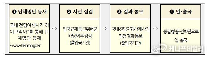 등록된 국내 전담여행사는 단체관광객 입국 24시간 전(선박 이용 시 입국 36시간 전)까지 단체관광객 명단을 하이코리아 누리집에 일괄 등재하면 된다.