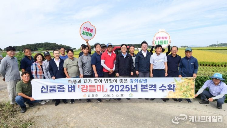 케나프데일리 이은성 기자 | 강화군은 12일 교동면 삼선리에서 신품종 조생종 벼 ‘강들미’ 수확 행사를 열었다.