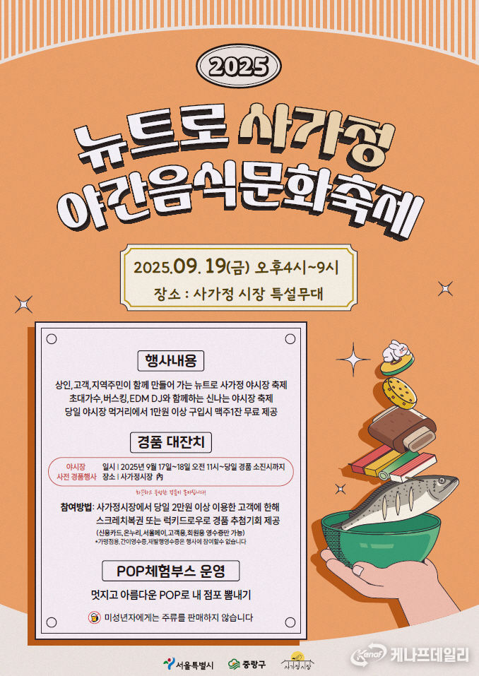 케나프데일리 이은성 기자 | 서울 중랑구의 대표 전통시장인 사가정시장이 9월 19일(목) 오후 4시부터 9시까지 ‘뉴트로 사가정 야간음식문화축제’를 개최한다. 이번 축제는 사가정시장이 주최하고 서울시와 중랑구청이 후원하며 (주)시장통이 수행기관으로 참여한다.