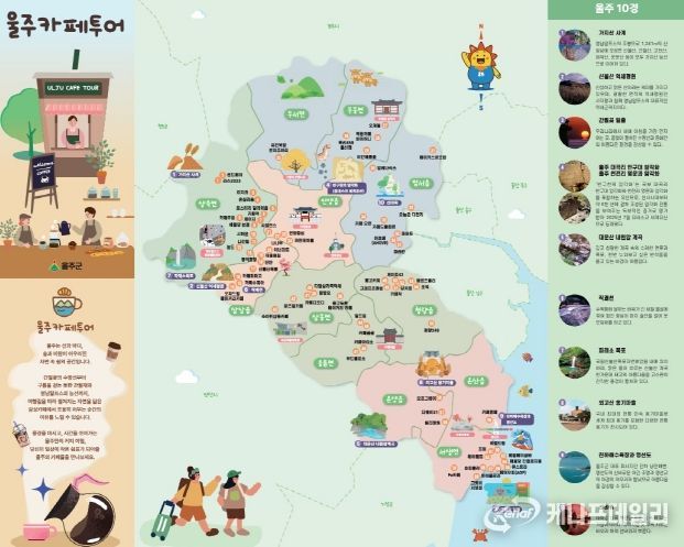 울주카페투어 지도에는 공고를 거쳐 모집·선정한 카페 70곳이 수록돼 관광객이 울주 전역의 다양한 카페를 쉽게 찾아볼 수 있다. 특히 울주 대표 관광지인 울주 10경을 방문하며 카페를 함께 즐길 수 있도록 여행 동선을 고려해 제작됐다.