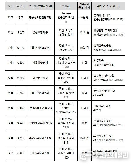 가을철 찾기 좋은 온천 10곳에 대한 자세한 정보는 ‘한국온천협회 누리집’에서 확인할 수 있다.