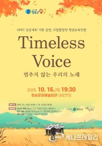 케나프데일리 이은성 기자 | 청송군은 오는 16일 저녁 7시 30분, 청송문화예술회관 대공연장에서 APEC 성공개최를 기원하는 국립합창단 청년교육단원 공연 ‘Timeless Voice – 멈추지 않는 우리의 노래’를 개최한다.