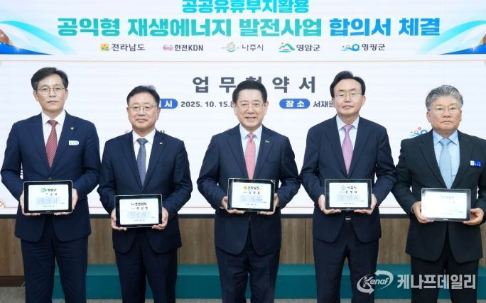 케나프데일리 이은성 기자 | 전라남도는 15일 새정부의 재생에너지 대전환 기조와 재생에너지 보급 확대 정책에 따라 나주시, 영광군, 영암군, 한전KDN과 탄소중립 실현·에너지 기본소득 실현을 위한 ‘공익형 재생에너지 발전사업’ 업무협약을 했다고 밝혔다.