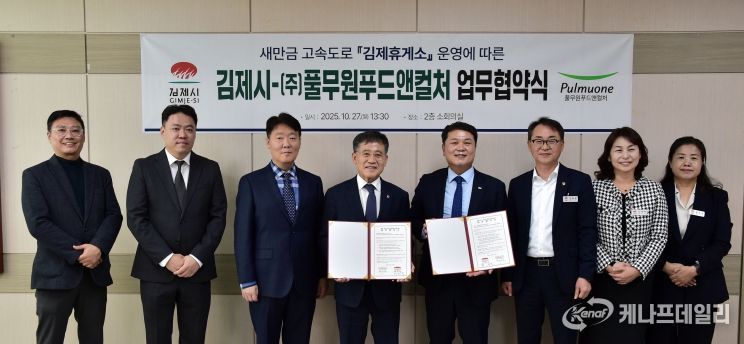 케나프데일리 이은성 기자 | 김제시는 27일 ㈜풀무원푸드앤컬처와 '새만금전주간' 고속도로 개통에 따라 새롭게 조성되는‘김제휴게소’운영에 따른 업무협약을 체결했다고 밝혔다.