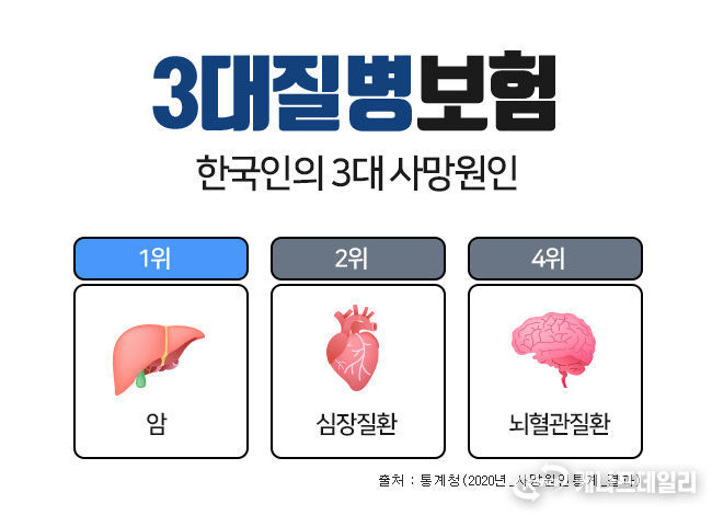 케나프데일리 이은성 기자 | 흔히 3대질병이라 일컫는 암, 심혈관질환, 뇌혈관질환은 통계청 발표자료에 따르면 한국인의 주요 사망원인 중에서 3위 폐렴을 제외하고 1~4위를 차지하고 있으며, 이전부터 지금까지도 살면서 가장 먼저 대비해야 하는 치명적인 질병으로 강조되고 있다. 이러한 중대질병에 대비하기 위하여 상기 세가지 치명적인 질병을 집중보장하는 3대질병진단비보험을 많이 가입하고 있다. 3대진단비보험은 각각의 질병을 중점적으로 보장하면서도 가입자 특성에 맞는 특약을 추가함으로써 종합건강보험으로도 활용할 수가 있다.