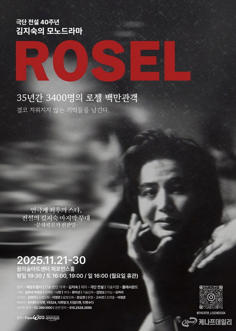 케나프데일리 이은성 기자 | 극단 전설 40주년 기념작이자 배우 김지숙의 마지막 공연인 모노드라마 〈로젤〉이 오는 11월 21일부터 30일까지 꿈의숲아트센터 퍼포먼스홀에서 막을 올린다. 35년간 3,400회 이상 공연되며 백만 명이 넘는 관객을 울린 이 작품은 여성의 주체성과 인간성의 회복을 그린 한국 연극사의 대표작으로 꼽힌다.