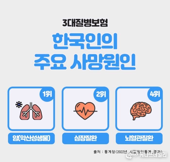 케나프데일리 이은성 기자 | 3대질병으로 일컬어지는 암, 뇌혈관질환, 심혈관질환은 한국인의 주요 사망원인에서 상위를 차지하고 있으며, 이에 대한 진단비를 집중적으로 보장해 주는 보험상품을 3대질병진단비 보험이라 할 수 있다.