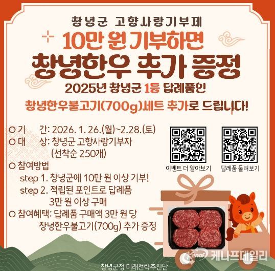 이번 이벤트는 고향사랑e음 플랫폼을 통해 10만 원 이상 기부하고 답례품을 3만 원 이상 주문한 기부자에게 창녕한우 1세트를 추가 제공하는 방식으로 운영된다.