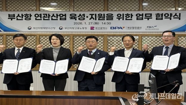 케나프데일리 이은성 기자 | 부산시는 27일 오후 2시 30분 부산항만공사 중회의실에서 부산지방해양수산청, 부산지방고용노동청, 부산항만공사, 부산항만산업총연합회와 '부산항 항만연관산업* 육성·지원을 위한 업무협약'을 체결했다고 밝혔다.