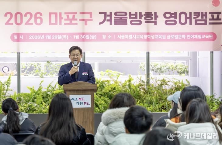 케나프데일리 이은성 기자 | 박강수 마포구청장은 1월 29일 오전 8시 30분, 마포구청 1층 어울림마당에서 열린 ‘2026 마포구 겨울방학 영어캠프 출정식’에 참석해 캠프에 참여하는 학생들을 격려하고 안전한 캠프 활동을 당부했다.